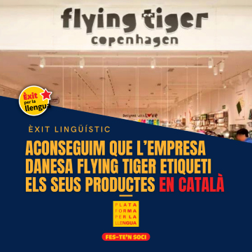 Plataforma per la Llengua ha aconseguit que la cadena danesa de botigues Flying Tiger Copenhaguen etiqueti finalment els seus productes en català. L’empresa, que ofereix objectes de regal amb dissenys propis que renova periòdicament, és la líder d’aquest sector i ha acabat incorporant la llengua a l’etiquetatge després de nou anys de pressió per part de l’ONG del català. L’empresa té 858 botigues a 27 països d’Europa i Àsia, i supera els 30 milions d’euros anuals de facturació.