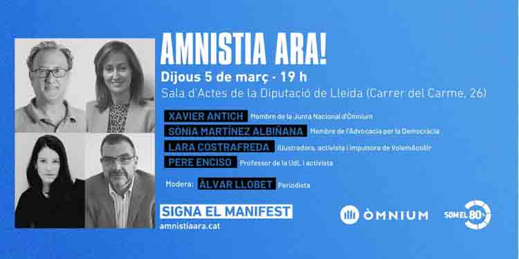 Xavier Antich, membre de la Junta Nacional d’Òmnium Cultural, participarà a l’acte de presentació de la campanya Amnistia Ara!, en el marc de la Plafatorma Som el 80% a Lleida. La taula rodona estarà moderada per Àlvar Llobet i comptarà amb la participació d’activistes socials com Sònia Martínez, Pere Enciso i Lara Costrafreda.