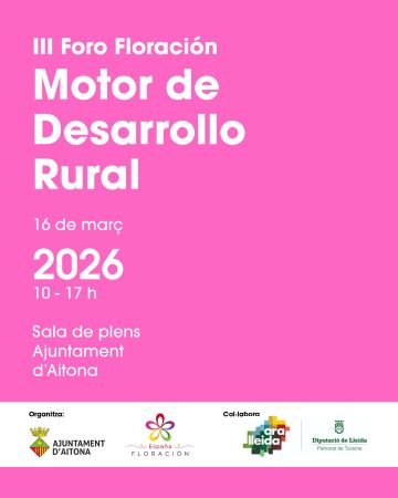 Aitona, 10 de març del 2026.- Aitona serà l’escenari aquest 16 de març del III Fòrum Floració: Motor de Desenvolupament Rural, una trobada que reunirà representants institucionals, experts, alcaldes i professionals vinculats al turisme i al sector primari per analitzar el paper de la floració com a recurs estratègic per al desenvolupament dels territoris rurals. La jornada està organitzada per ‘España en Floración’ i l’Ajuntament d’Aitona, amb la col·laboració del Patronat de Turisme de la Diputació de Lleida, i se celebrarà a la Sala de Plens de l’Ajuntament. El programa, de 10 a 17 hores, combinarà ponències i taules d’anàlisi amb una visita guiada a la floració, un dels grans atractius paisatgístics i turístics del municipi.
