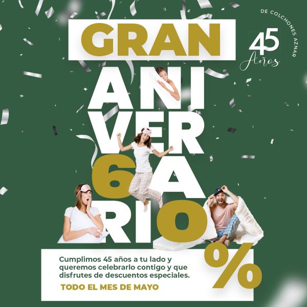 Entre sus productos, podemos encontrar camas, cabeceros y complementos adicionales, tales como fundas protectoras y rellenos nórdicos. Todos estos productos se ofrecen ahora rebajados de precio con motivo del 45º Aniversario de Colchones Aznar, que celebra su cumpleaños este mes de mayo de 2022 por todo lo alto, con cupones descuento y ofertas que se aplican también en los productos comprados a través de su página web.