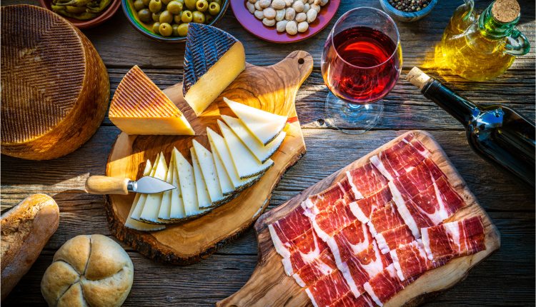 Con quesos: Combina embutidos ibéricos con una selección de quesos artesanales. Se pueden incluir variedades como el queso manchego, el queso de cabra o el queso azul, proporcionando una amplia gama de sabores y texturas para complementarlos.