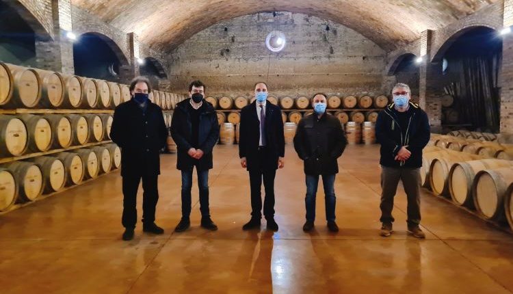 El sbdelegat José Crespín, acompanyat pel Cap de l’Àrea del Ministeri d’Agricultura, Pesca i Alimentació a Catalunya, José Luís Guarga, i el Cap d’Agricultura de la Subdelegació de Lleida, Jaume Banchs, ha estat rebut pel propietari del celler i president de la DO Costers del Segre, Tomàs Cusiné, amb qui ha recorregut les seves instal·lacions centenàries considerades el celler més antic de Catalunya.