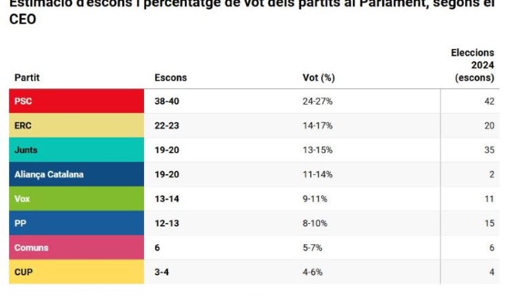 Barcelona – El baròmetre del Centre d’Estudis d’Opinió (CEO) presentat aquest dilluns apunta a un auge dels dos partits d’extrema dreta. Aliança empataria amb Junts (19-20 escons) i Vox avançaria al PP (13-14). Entre les dues superarien la cinquena part dels vots i passarien de la trentena d’escons. El director del CEO, Joan Rodríguez Teruel, ha conclòs que «els votants de Vox i Aliança cada cop s’assemblen més». Així, els joves són els qui més donen suport a les dues formacions, que tenen un electorat que s’informa de política sobretot per xarxes socials i que té la immigració com a principal problema. L’enquesta apunta a «un vot dual de dreta radical», amb gent disposada a donar suport a Sílvia Orriols al Parlament i a Santiago Abascal al Congrés.