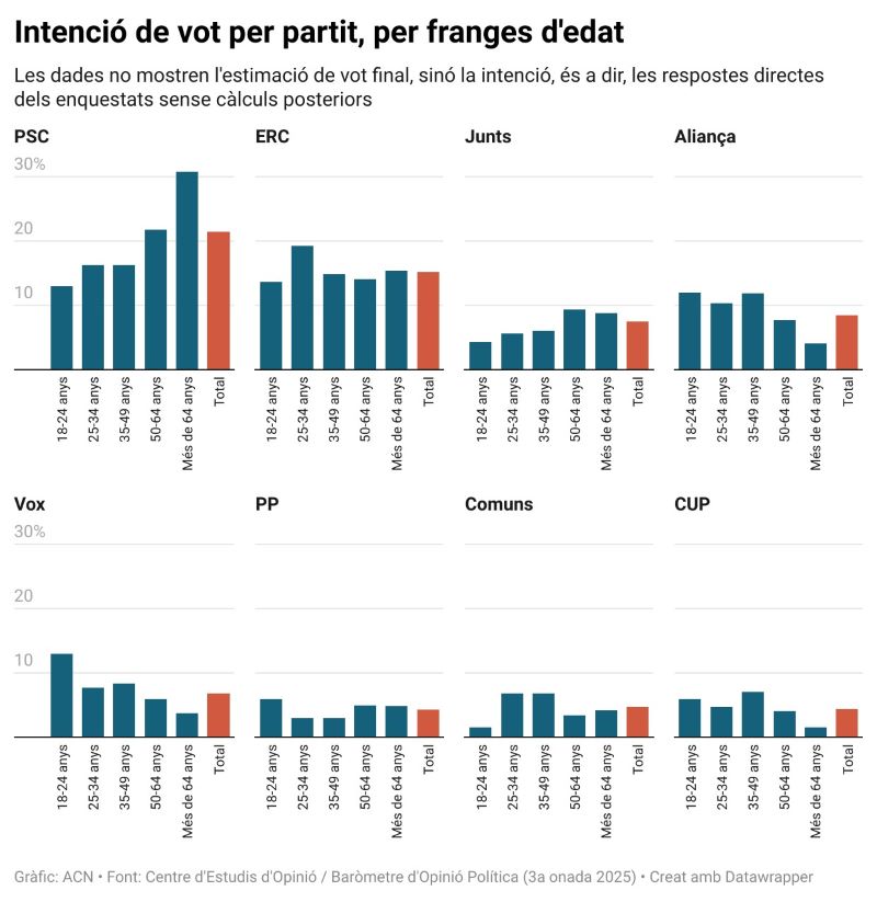 La franja d’edat d’entre 18 i 24 anys és la que més dona suport a tots dos partits, amb una intenció de vot sensiblement superior a la mitjana que reben del conjunt de la població. El 12% dels joves han manifestat que votaran Aliança, i el 13%, a Vox, unes proporcions a l’altura del PSC i ERC, els dos partits que lideren la intenció de vot –un indicador que es refereix a les respostes recollides abans dels càlculs posteriors per obtenir una estimació del resultat real dels comicis.