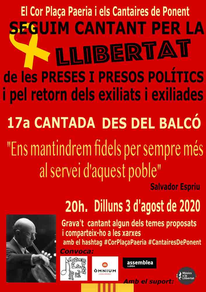 Després d’una breu condició de 3er grau que  permitia certa llibertat als  presos polítics, la justicia espanyola, altre cop ha decidit dur-los a la garjola; i en el seu honor, el Cor Cantaires de Ponent/Plaça Paeria, els hi canta com cada dilluns d’uns anys ençà. Coincideix aquesta setmana en què el rei borbó J,C. I se’n pot anar tranquil.lament a l’exili, però en unes condicions gens semblants als dels politics catalans