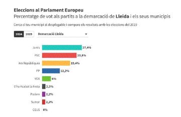 Barcelona – Junts ha estat la força més votada a la demarcació de Lleida, amb 32.642 vots i un 27,42%, amb el 100% escrutat. En segon lloc han quedat els socialistes. El PSC ha obtingut a la demarcació 28.368 vots i un 23,83%. Això l’ha fet quedar per davant de d’ERC, que ha aconseguit 23.038 vots i un 19,35%. El PP ha estat la quarta força més votada amb 14.573 paperetes de lleidatans i un 7,42% dels vots, i per darrere ha quedat Vox amb un 6,04% i 7.197% paperetes. Curiosament, els ultres de S’ha acabat la festa (2,32% i 2.764 vots) han passat per davant de Podem (2,21%) i Comuns (2,16%).
