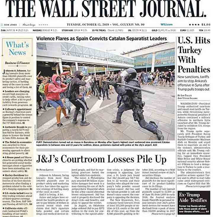 La imatges de les càrregues policials és portada al Wall Street Journal com al Financial Times