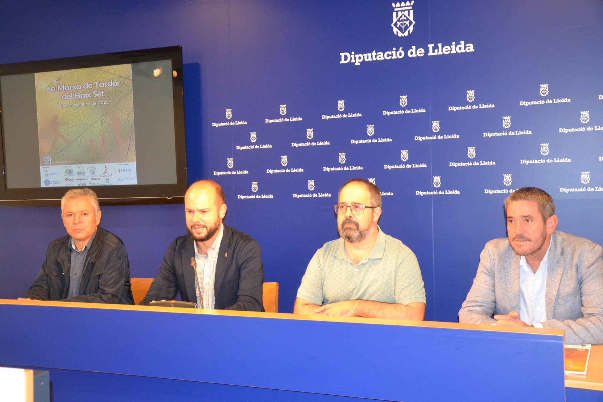 El diputat Jordi Verdú; el tinent d’alcalde de Montoliu de Lleida, Josep Ramon Mòdol; el tinent d’alcalde de Sudanell, Ramon Biosca, i el director d’ASPROS, Enric Herrera, han presentat aquest divendres la 6a Marxa de Tardor del Baix Set, que se celebrarà el dia 6 de novembre al municipi de Montoliu de Lleida amb quatre recorreguts i en la qual s’esperen uns 600 participants i la col·laboració d’una cinquantena de voluntaris.