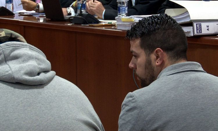 Imatge de l’acusat de la mort de dos Agents Rurals a Aspa, Ismael R., parlant amb el propietari de l’arma del crim, durant el judici que se celebra a l’Audiència de Lleida. Imatge del 21 de gener del 2019.