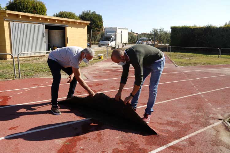 Pla obert on es poden veure l’alcalde d’Arbeca, Sergi Pelegrí, i el tinent d’alcalde Francesc Roset, aixecant una part del terra de la pista d’atletisme, malmesa durant els aiguats de fa un any, el 8 d’octubre de 2020. Foto. Oriol Bosch