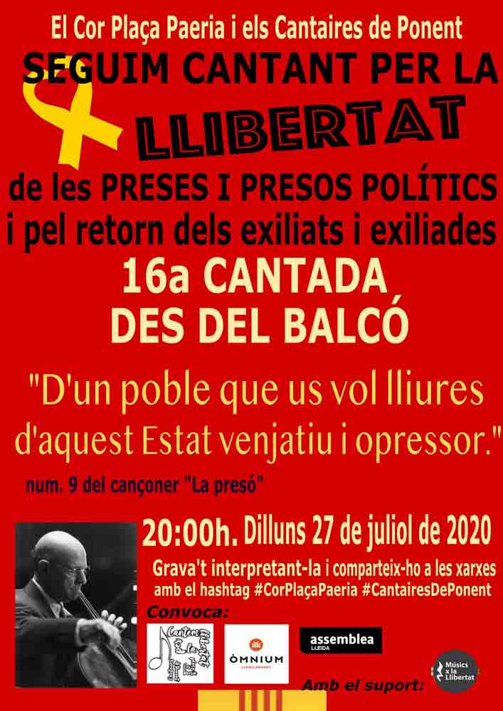 Dilluns 27 de Juliol coincideix amb el traspàs de l'autor de la cançó habitual dels Cantaires de Ponent/Cor Plaça Paeria, "QUÈ VOLEN AQUESTA GENT" i per aquest motiu, avui també és cantada en ple confinament en honor seu, a part és clar, per demanar la llibertat dels presos polítics i exiliats