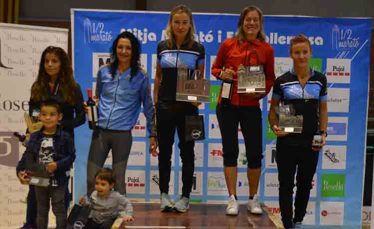 En dones, Eva Ribalta, guanyadora de la Mitja de Mollerussa del 2014, s’ha imposat amb un crono d’1.24.49, pel davant d’una altra corredora que ja sap el que és guanyar a Mollerussa, Rosamari Carulla (Xafatolls), vencedora al 2016 i avui segona 1.25.29. Tercera ha entrat l’actual campiona de les Mitges de Ponent, Anna Artal (Amics Atletisme Andorra), amb 1.27.47.