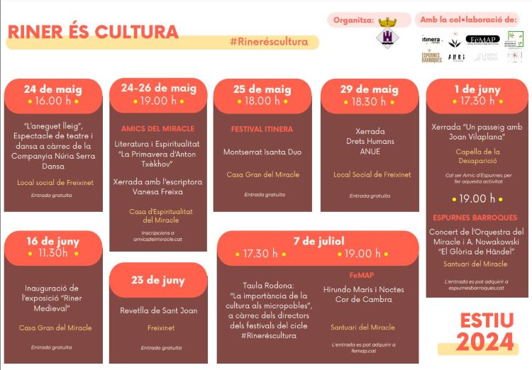 L’exposició “Temps de Torres”, que recull objectes inèdits de la història del municipi i de la comarca del Solsonès, i un acte centrat en l’ONU i els Drets Humans, seran els actes més destacats del programa estiuenc “Riner és Cultura” organitzat per l’Ajuntament del municipi en col·laboració amb altres entitats. El programa tindrà lloc entre maig i setembre i inclourà més d’una vintena d’actes de caire musical (amb concerts de música antiga, música barroca, música popular, música brasilera i maridatges amb gastronomia), representacions de teatre i dansa, cinema a la fresca, visites guiades, trobades festives i activitats infantils, a més de la taula rodona “La importància de la cultura als micropobles” i la presentació del llibre “La Catalunya emergida”. Els actes tindran lloc a la Casa de l’Espiritualitat, a la Casa Gran del Miracle i a altres indrets del municipi com són els nuclis de Su, Freixinet i a Santa Susanna.