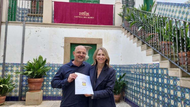 A la imatge, el compositor Òscar Barqué Farrús, autor de la sardana, i Mireia González Antó, presidenta de la Fundació Castell del Remei, ambdós en el pati de la casa-palau del Castell del Remei el dia de l’estrena de la peça musical.