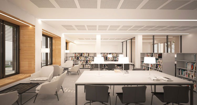 Millora en tots els acabats interiors, destacant el revestiment de fusta en espais de circulació i la millora de l’acústica a la sala d’actes i la biblioteca